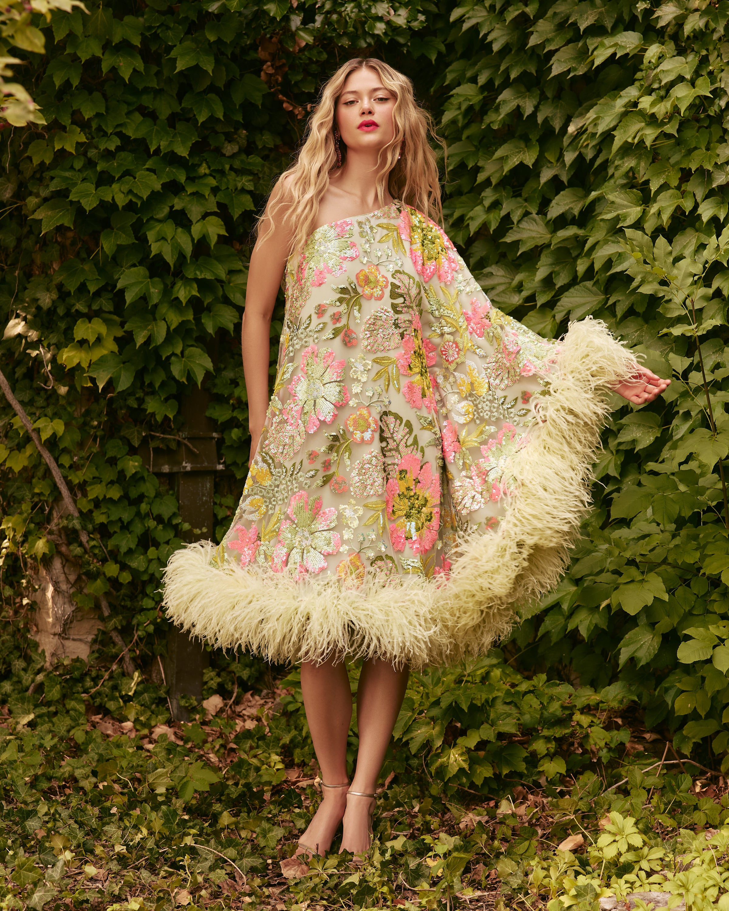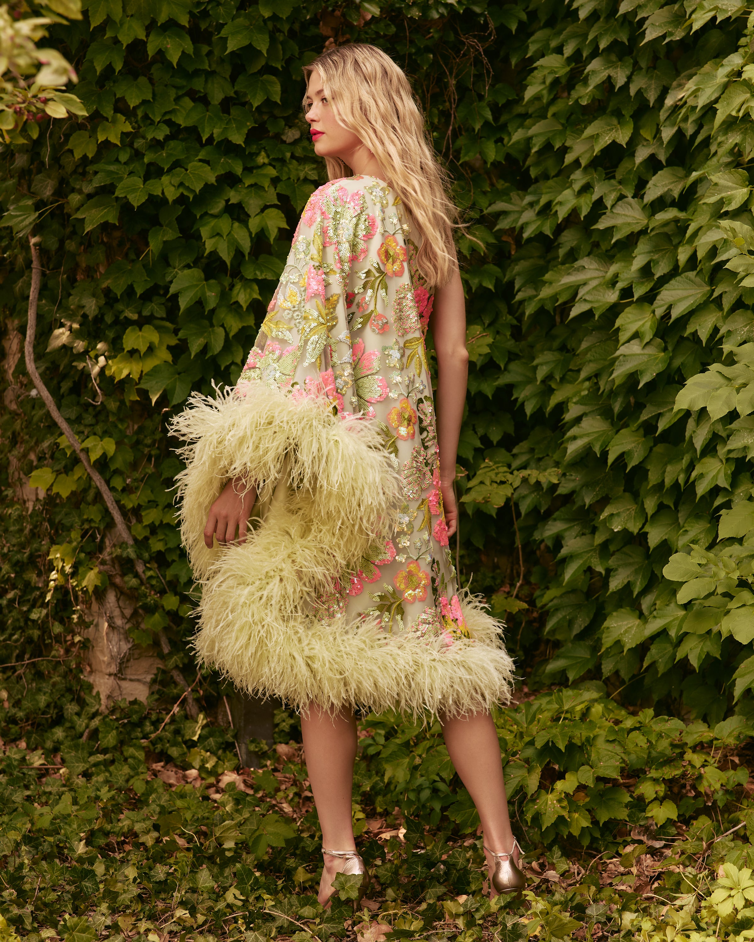 Flared sleeve with ostrich feather trim around sleeve and hem